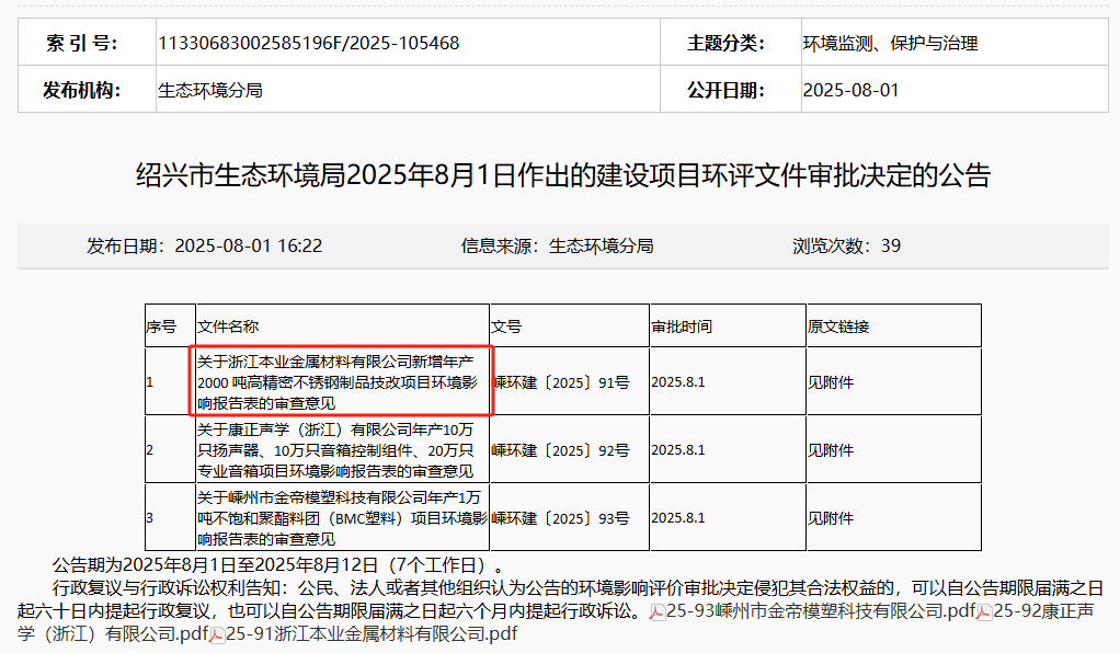 2025年8月1日,紹興市生態(tài)環(huán)境局嵊州分局就浙江本業(yè)金屬材料有限公司新增年產(chǎn)2000噸高精密不銹鋼制品技改項目環(huán)境影響報告表作出審查意見并對外進(jìn)行公告,公告期:2025年8月1日至2025年8月12日(7個工作日)。